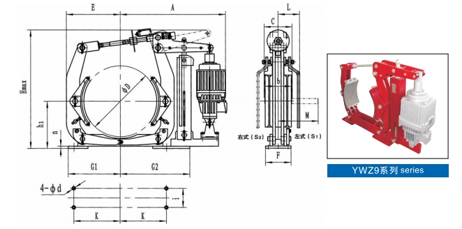 YWZ9系列制動器連接尺寸和制動力矩參數(shù)符合JB/ZQ4388-86和GB6333-86(帶A系列)標準,技術(shù)要求符合JB/T6406-2006標準