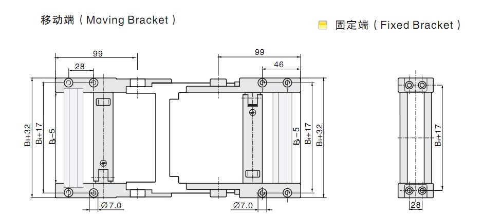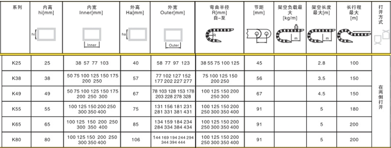 2. 相同系列的拖鏈內(nèi)高,外高,節(jié)距相同,拖鏈寬度,彎曲半徑可有不同的選擇。