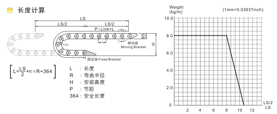 2. 相同系列的拖鏈內(nèi)高,外高,節(jié)距相同,拖鏈寬度,彎曲半徑可有不同的選擇。