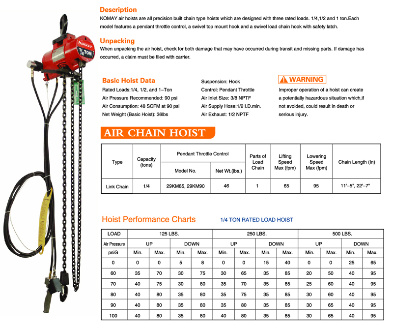 Description:KOMAY air hoists are all precision built chain type hoists which are designed with three rated loads,1/4, 1/2 and 1 ton. Each model features a pendant throttle control, a swivel top mount hook and a swivel load chain hook with safety latch.