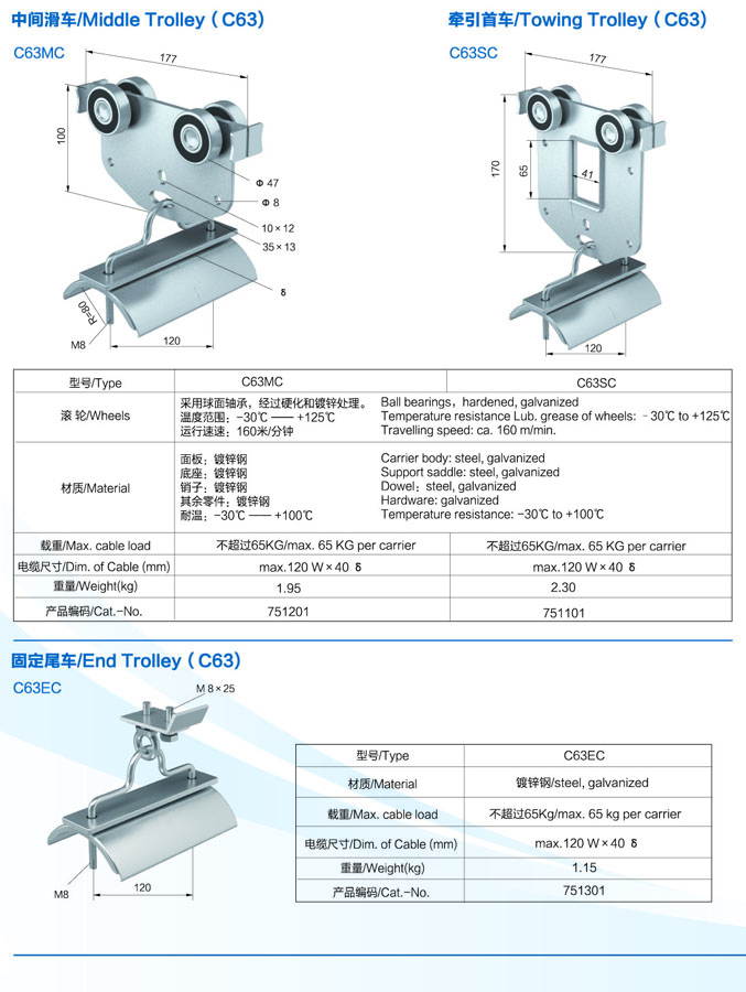 KOMAY cable trolleys not only deliver power and control to mobile equipment which has reciprocal motion but also support large quantities of data cables including optic fibers traveling independently from the mobile machinery. The relevant control carriers with and without push button lifting are also shown in this catalog.